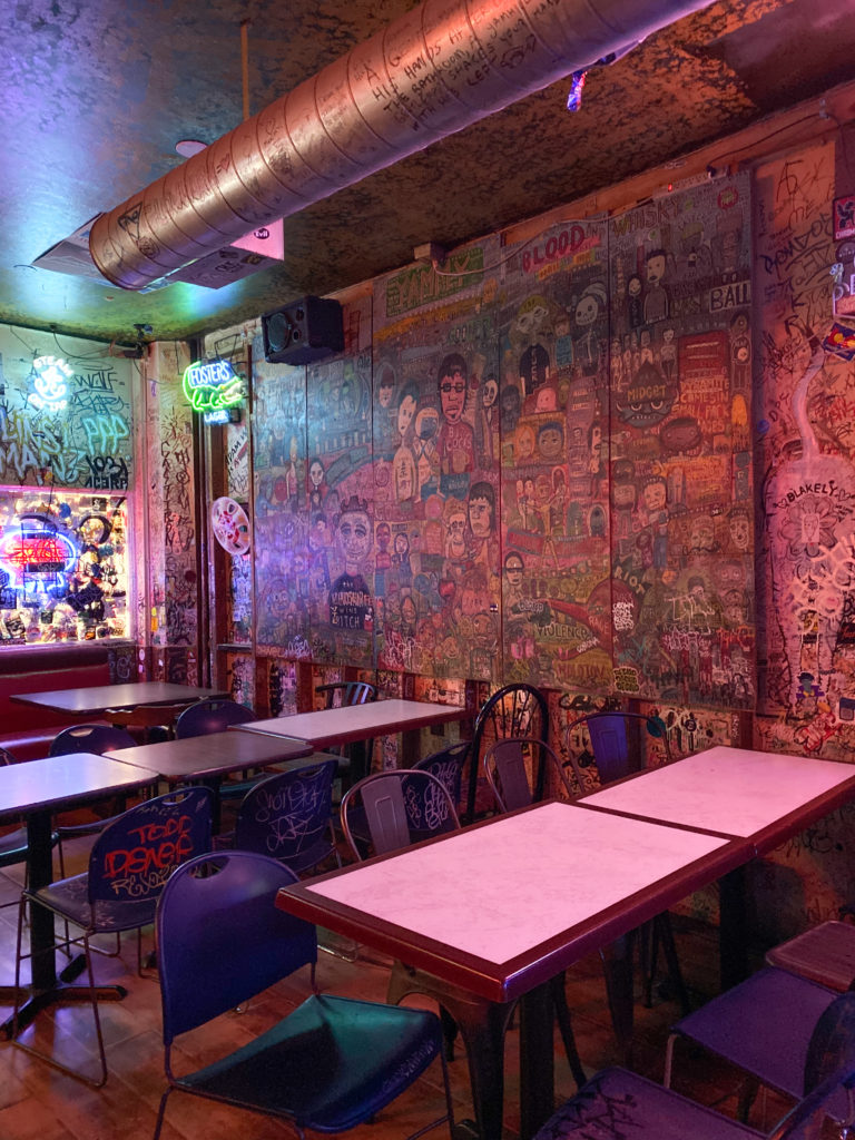 Dark, shotgun-shack style space with graffiti on every surface (and not the stylized, well-heeled artsy stuff either). Small, maybe 10 stools at the bar plus some crappy tables and chairs. Dirty. Industrial strength cleaner smells assault the nostrils. Unfriendly but not necessarily unwelcoming. The bartender was pretty nosy actually. Maybe he doesn’t get many outsiders coming in and the regulars we saw were anything but chatty.